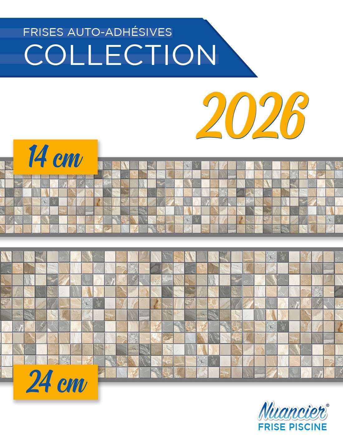 Vendue en bobine de 5 mètres linéaires, elle existe en 14 cm ou 24 cm de hauteur. Ces bandes colorées aux motifs inspirés de la mosaïque ne présentent aucune texture ou relief.